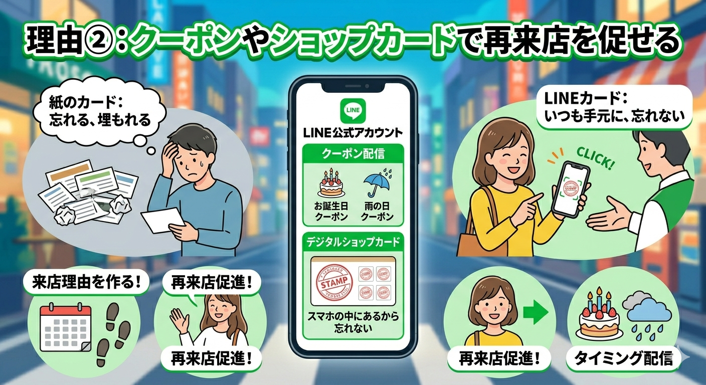 理由②:クーポンやショップカードで再来店を促せる