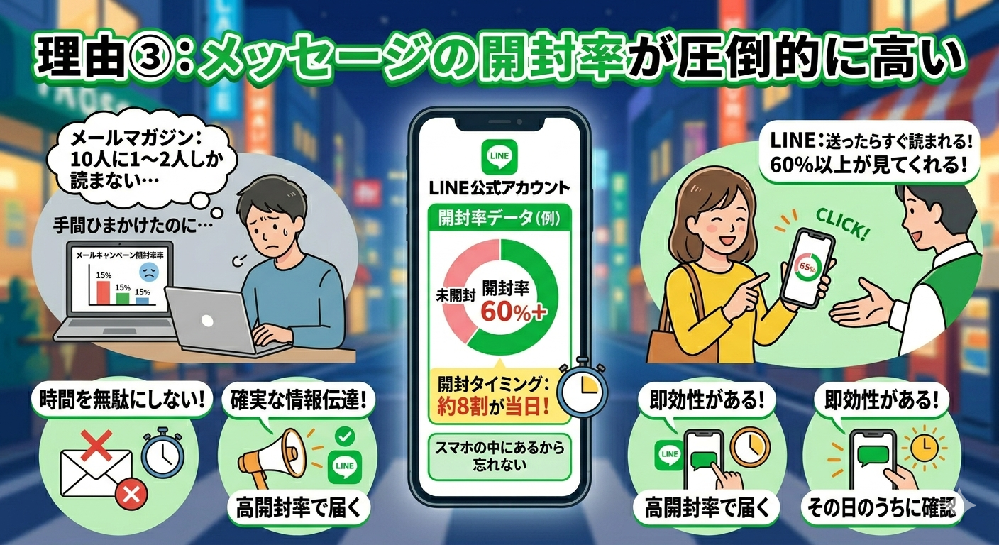つまり、お客様に情報を届けたいなら、LINEが最も届きやすい手段なのです。