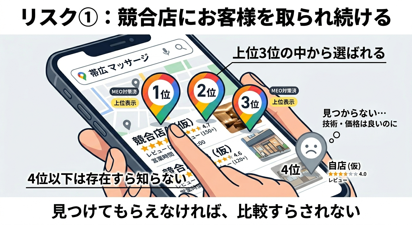 「まあ、やらなくても大丈夫だろう」と思っている方も多いかもしれません。しかし、MEO対策をしないことで、以下のようなリスクが確実に発生しています。